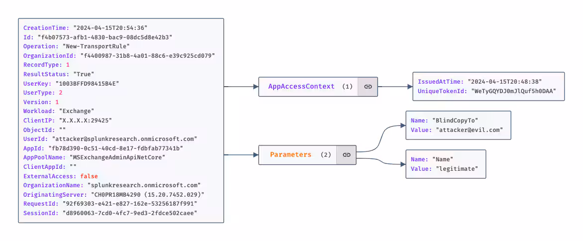 In the “New-InboxRule” and “Set-InboxRule” log events, the “Parameters” object details specific settings of the rule, such as “ForwardTo”. By focusing on such settings within “Parameters”, we can pinpoint rules that facilitate forwarding emails. In the “UpdateInboxRules” log event, the “OperationProperties” object holds the critical information. This includes actions like “ForwardToRecipientsAction”, providing us with the necessary details to filter and identify email forwarding inbox rules.