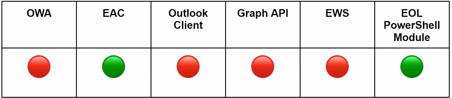 The table below outlines the methods we used to simulate mailbox forwarding. We’ll skip the details on straightforward methods, such as using a web browser, and focus on the more technically interesting method: the EOL PowerShell module
