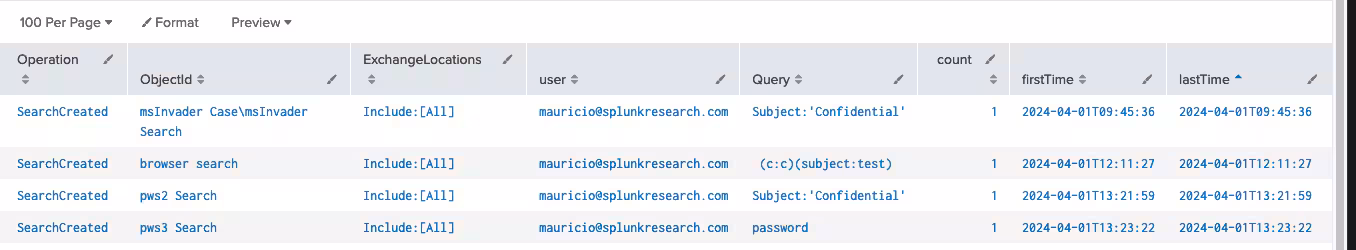 | stats count earliest(_time) as firstTime latest(_time) as lastTime by Operation, ObjectId, ExchangeLocations, user_id, Query