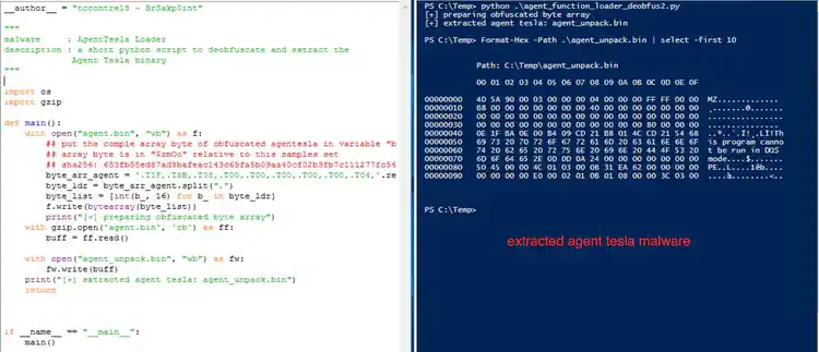Figure 2.2 shows the python script we wrote to extract the actual AgentTesla malware binary. This python script will drop the Agent Tesla malware as agent_unpack.bin in the current working directory. The script can be found on Github agent_function_loader_deobfus2.py.