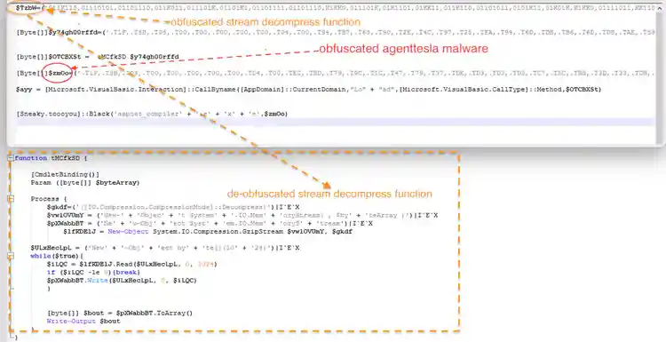 The variable named $TzbW contains a string that when deobfuscated, implements the tMCfkSD function also shown on Figure 2. This function will in turn deobfuscate and decompress the array of bytes stored in the variable named $zmOo. This deobfuscated and decompressed version is the actual .NET assembly Agent Tesla malware that will be executed in memory using PowerShell reflection.