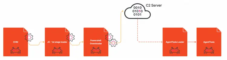 This Agent Tesla variant uses a compiled HTML file (.chm) to conceal its malicious code and gain an initial foothold on the victim endpoint. The file has an embedded and obfuscated JavaScript script that invokes PowerShell to download a second stage.