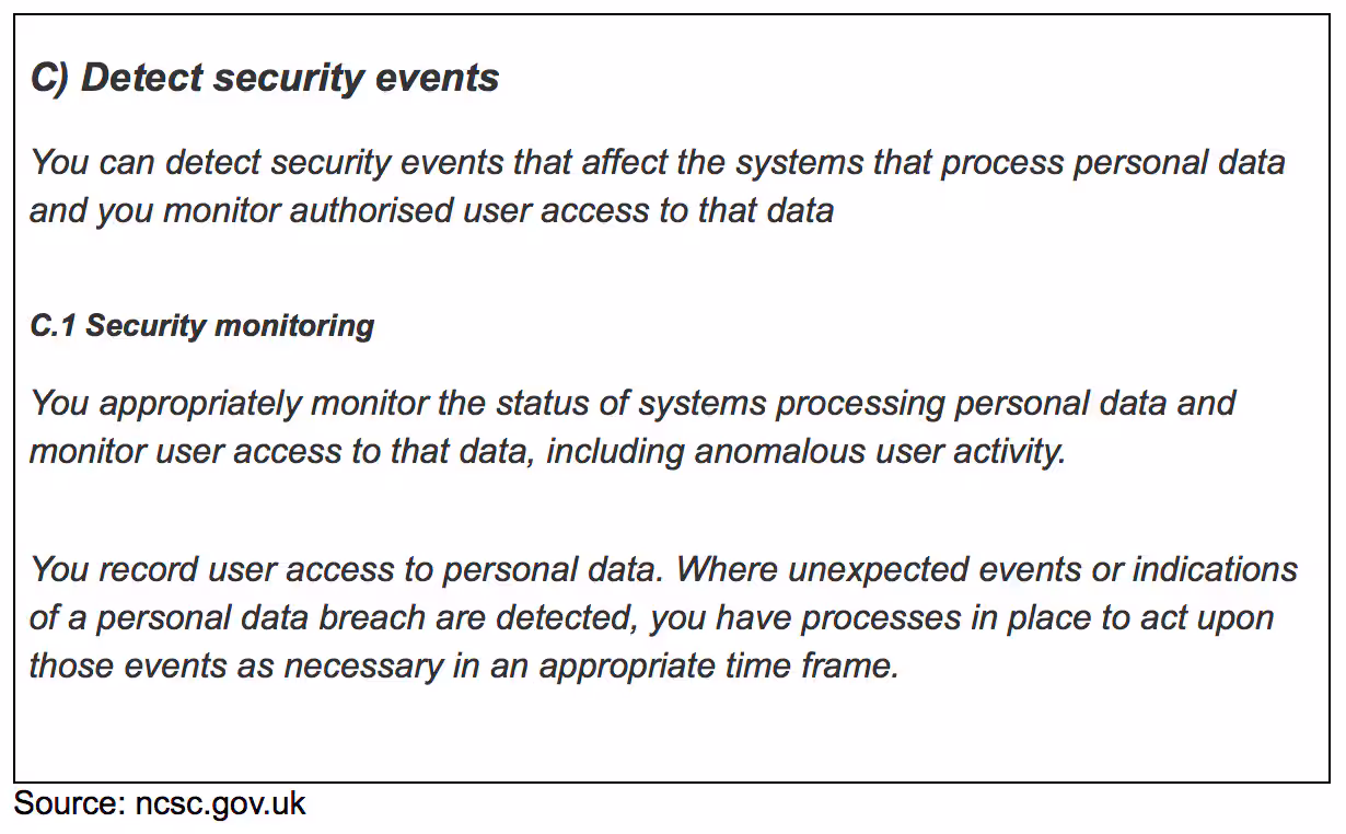 Quoting from the ICO and NCSC guidance, I want to point out the importance of security monitoring, and how data collection from your business applications falls under the GDPR: