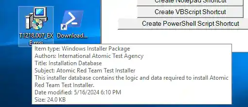 Now, let’s check out the “Create PowerShell Script Shortcut”. This test will create the LNK, and the Target will be to run a PowerShell encodedcommand that downloads a MSI package from Atomic Red Team.