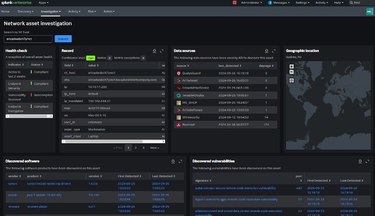 Splunk Asset and Risk Intelligence constructs asset inventories by consolidating data from diverse sources, including log files, network devices, cloud services, workstations, servers, and databases. The investigation dashboards offer a holistic context for investigations, providing visibility into critical asset data points such as health checks, geographical information, data sources, discovered vulnerabilities, and software. These vulnerabilities can be used to configure risk-scoring filters and rules that are also displayed in this dashboard, and we will discuss that further later.