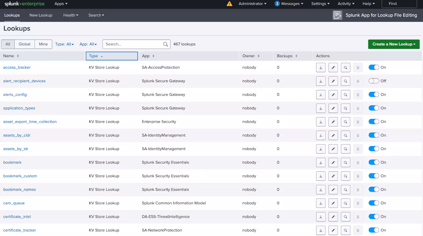 The actions column on the lookup page also has new icon buttons to create a more intuitive and cleaner user interface. Users can now turn off or turn on a KV store lookup with a toggle switch, a user interface change that is designed to help make the app capabilities as easy as possible for users.