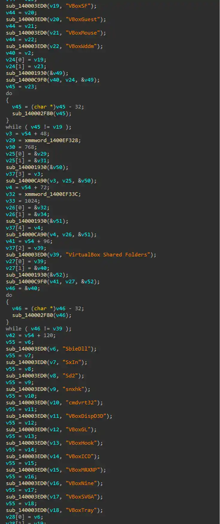 Figure 2 displays screenshots of the Meduza Stealer code, which initializes checks for known virtual machine and sandbox components. These components are commonly targeted by threat actors to determine if their malware is running in a virtualized environment. If any of these components are detected, Meduza Stealer will terminate its execution to avoid analysis or detection.