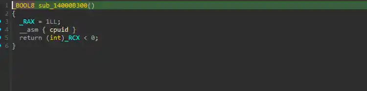 Figure 1 shows a screenshot of the pseudocode for a Meduza Stealer function used to check if it is running in a virtual machine (VM). The function utilizes the CPUID instruction with RAX set to 1, which returns the 31st bit indicating whether the code is executing within a VM environment. This technique enables the malware to identify and potentially evade virtualized analysis setups.