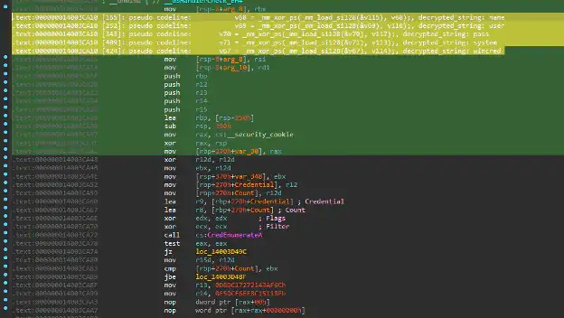 This malware uses the CredEnumerateA() API to steal sensitive information. In this example, the malware is specifically targeting credentials stored on the victim's system. The CredEnumerateA() function is part of the Windows API and allows applications to enumerate the credentials stored in the Windows Credential Manager. These credentials may include usernames, passwords, and other sensitive data used for authentication by various applications and services.
