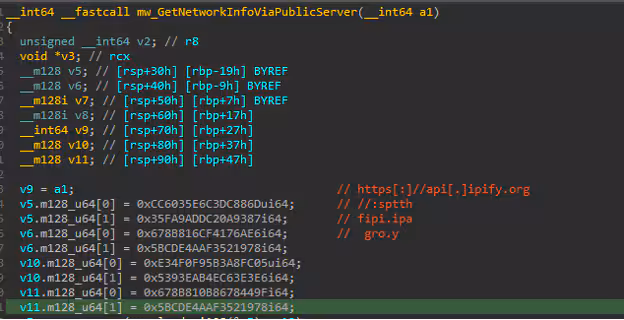 This malware uses api[.]ipify[.]org as part of its operation. This API is a public service designed to provide the external (public) IP address of the device making the request. Meduza Stealer uses it to obtain the victim's IP address, which can help attackers gather information about the user's network, location, or ISP.