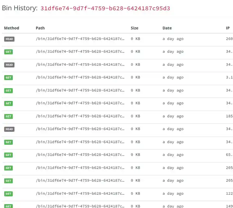 Mocky is free and open, therefore it allows us to request every script and access log being hosted by that Bin Identifier. We can do this via the website by going to the Bin ID and hitting the /log or /view. In addition, Mocky provides an API endpoint for each. For example, we can retrieve the log and view the data hosted.
