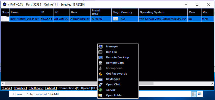 NjRAT boasts a multitude of capabilities designed for commanding and extracting sensitive data from the compromised host. These encompass the ability to manipulate files, processes, services, and registries, as well as to establish remote connections, capture screens, utilize keyloggers, mic recording and much more.