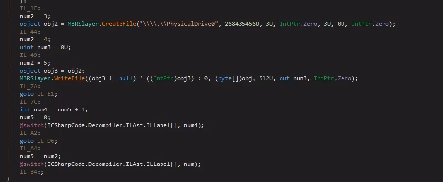 In addition to its standard keylogging functionality, this particular variant of NjRAT possesses the ability to carry out a highly destructive action: wiping or destroying the Master Boot Record (MBR). When this NjRAT malware variant receives a command string, such as 'FuckMBR' from its C2 server, it proceeds to overwrite the actual MBR code, located within the '\\.\PhysicalDrive0' partition, with a customized boot sector embedded within its code. This malicious action renders the compromised host non-bootable, replacing the boot process with a message indicating that the system has been infected.