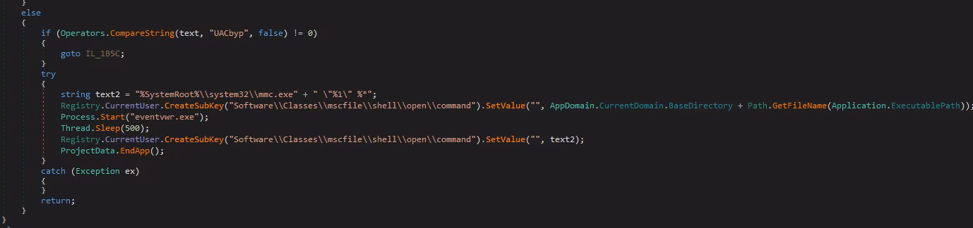 It is also capable of bypassing the Windows OS User Account Control (UAC) security feature to elevate process privileges on the compromised system. NjRAT abuses the registry checks by eventvwr.exe to look for the location of mmc.exe which is used to open the eventvwr.msc saved console file. By strategically placing the NjRAT file path within this registry entry, it can execute as a high-integrity process without triggering a UAC prompt for the user.