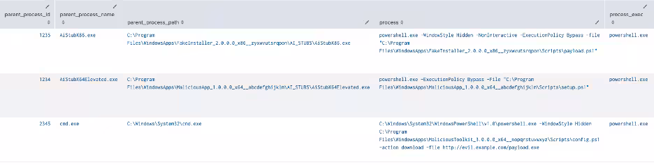 The following analytic identifies the execution of Advanced Installer MSIX Package Support Framework (PSF) components, specifically the AI_STUBS executables. This detection leverages data from Endpoint Detection and Response (EDR) agents, focusing on process paths and names. This activity is significant as adversaries have been observed packaging malicious content within MSIX files built with Advanced Installer to bypass security controls. These AI_STUBS executables (with original filename 'popupwrapper.exe') are hallmark artifacts of potentially malicious MSIX packages.