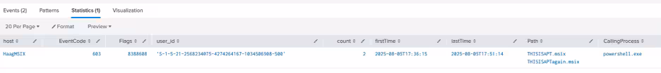 | stats count min(_time) as firstTime max(_time) as lastTime values(Path) as PackagePath by host EventCode user_id