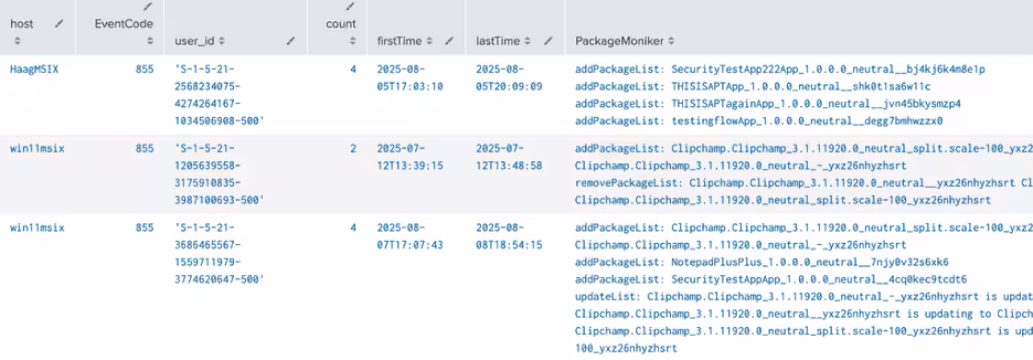 | stats count min(_time) as firstTime max(_time) as lastTime values(PackageMoniker) as PackageMoniker by host EventCode user_id