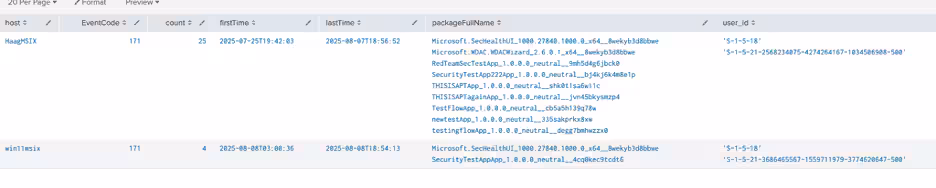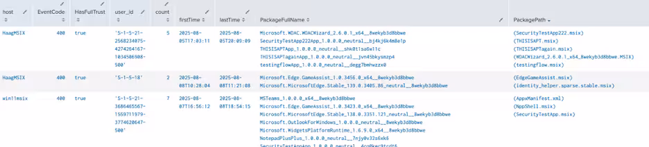 | stats count min(_time) as firstTime max(_time) as lastTime values(PackageFullName) as PackageFullName values(Path) as PackagePath values(PackageSourceUri) as PackageSourceUri values(PackageDisplayName) as PackageDisplayName values(CallingProcess) as CallingProcess values(IsCentennial) as IsCentennial by host EventCode HasFullTrust user_id