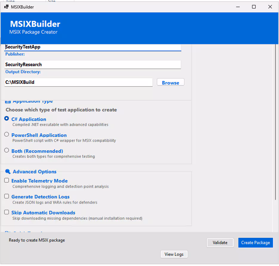 .\Create-MSIXPackage.ps1 -PackageName "SecurityTest" -Publisher "RedTeam" -OutputPath "C:\Output" -AppType "Both"