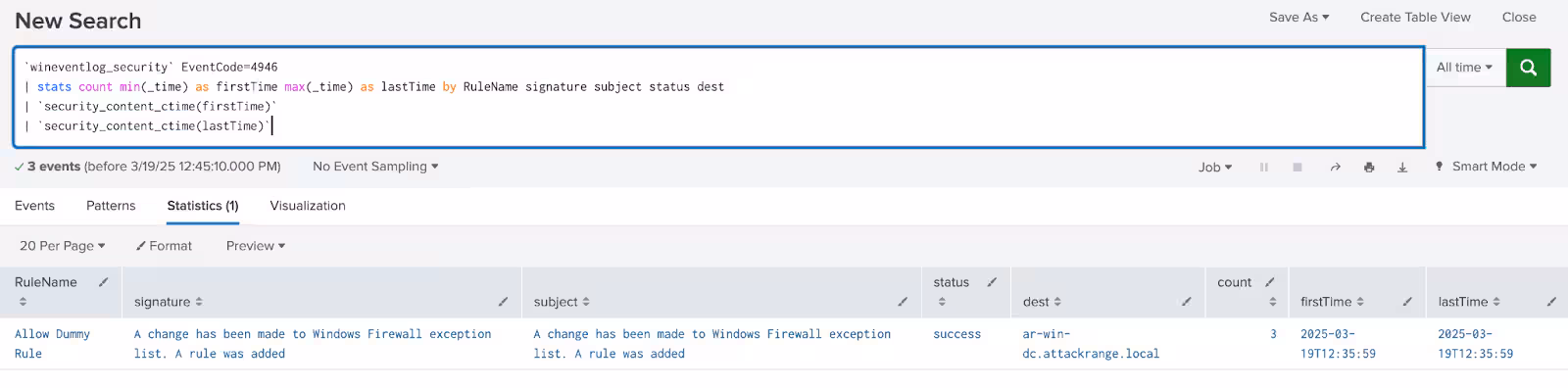 | stats count min(_time) as firstTime max(_time) as lastTime by RuleName signature subject status dest ProcessID