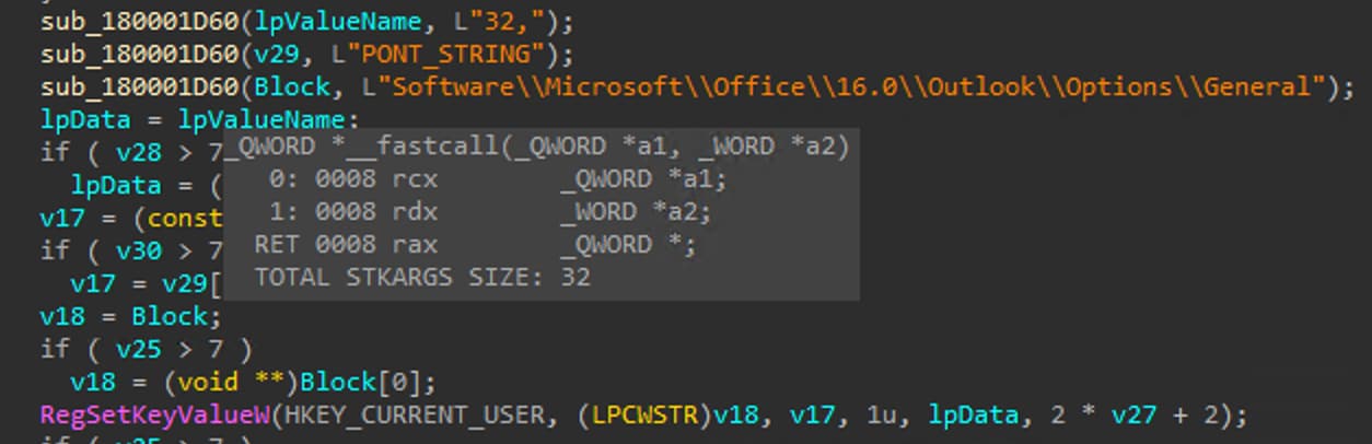 The DLL does a few other things after all the powershell commands to allow the malicious macro to function properly. Primarily it modifies several registry entries. One of these is the LoadMacroProviderOnBoot key. By default, Outlook supports running VBA macros stored in the VbaProject.otm file we mentioned. This registry value acts as a switch for automatic loading of these macros on startup.
