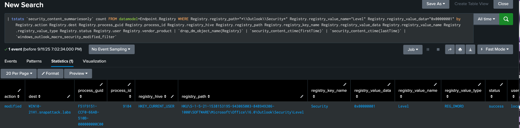 | tstats `security_content_summariesonly` count FROM datamodel=Endpoint.Registry WHERE Registry.registry_path="*\\Outlook\\Security*" Registry.registry_value_name="Level" Registry.registry_value_data="0x00000001" by Registry.action Registry.dest Registry.process_guid Registry.process_id Registry.registry_hive Registry.registry_path Registry.registry_key_name Registry.registry_value_data Registry.registry_value_name Registry.registry_value_type Registry.status Registry.user Registry.vendor_product | `drop_dm_object_name(Registry)` | `security_content_ctime(firstTime)` | `security_content_ctime(lastTime)`