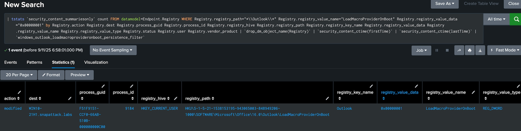 | tstats `security_content_summariesonly` count FROM datamodel=Endpoint.Registry WHERE Registry.registry_path="*\\Outlook\\*" Registry.registry_value_name="LoadMacroProviderOnBoot" Registry.registry_value_data="0x00000001" by Registry.action Registry.dest Registry.process_guid Registry.process_id Registry.registry_hive Registry.registry_path Registry.registry_key_name Registry.registry_value_data Registry.registry_value_name Registry.registry_value_type Registry.status Registry.user Registry.vendor_product | `drop_dm_object_name(Registry)` | `security_content_ctime(firstTime)` | `security_content_ctime(lastTime)`
