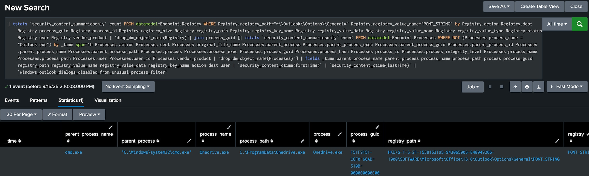 | tstats `security_content_summariesonly` count FROM datamodel=Endpoint.Registry WHERE Registry.registry_path="*\\Outlook\\Options\\General*" Registry.registry_value_name="PONT_STRING" by Registry.action Registry.dest Registry.process_guid Registry.process_id Registry.registry_hive Registry.registry_path Registry.registry_key_name Registry.registry_value_data Registry.registry_value_name Registry.registry_value_type Registry.status Registry.user Registry.vendor_product | `drop_dm_object_name(Registry)`| join process_guid [| tstats `security_content_summariesonly` count FROM datamodel=Endpoint.Processes WHERE NOT (Processes.process_name = "Outlook.exe") by _time span=1h Processes.action Processes.dest Processes.original_file_name Processes.parent_process Processes.parent_process_exec Processes.parent_process_guid Processes.parent_process_id Processes.parent_process_name Processes.parent_process_path Processes.process Processes.process_exec Processes.process_guid Processes.process_hash Processes.process_id Processes.process_integrity_level Processes.process_name Processes.process_path Processes.user Processes.user_id Processes.vendor_product | `drop_dm_object_name(Processes)`] | fields _time parent_process_name parent_process process_name process_path process process_guid registry_path registry_value_name registry_value_data registry_key_name action dest user | `security_content_ctime(firstTime)` | `security_content_ctime(lastTime)`