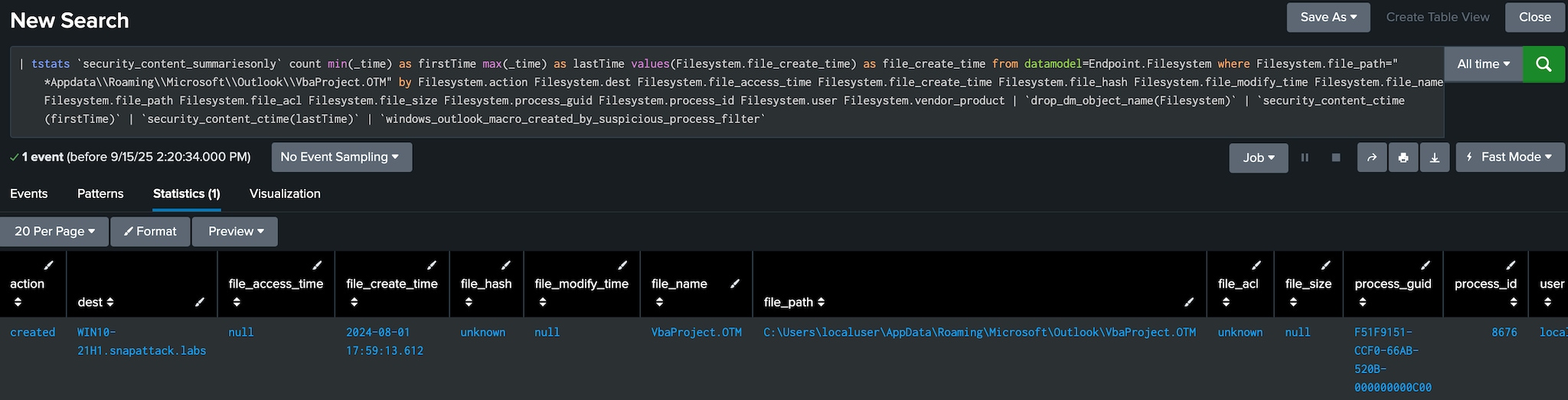 | tstats `security_content_summariesonly` count min(_time) as firstTime max(_time) as lastTime values(Filesystem.file_create_time) as file_create_time from datamodel=Endpoint.Filesystem where Filesystem.file_path="*Appdata\\Roaming\\Microsoft\\Outlook\\VbaProject.OTM" by Filesystem.action Filesystem.dest Filesystem.file_access_time Filesystem.file_create_time Filesystem.file_hash Filesystem.file_modify_time Filesystem.file_name Filesystem.file_path Filesystem.file_acl Filesystem.file_size Filesystem.process_guid Filesystem.process_id Filesystem.user Filesystem.vendor_product | `drop_dm_object_name(Filesystem)` | `security_content_ctime(firstTime)` | `security_content_ctime(lastTime)`