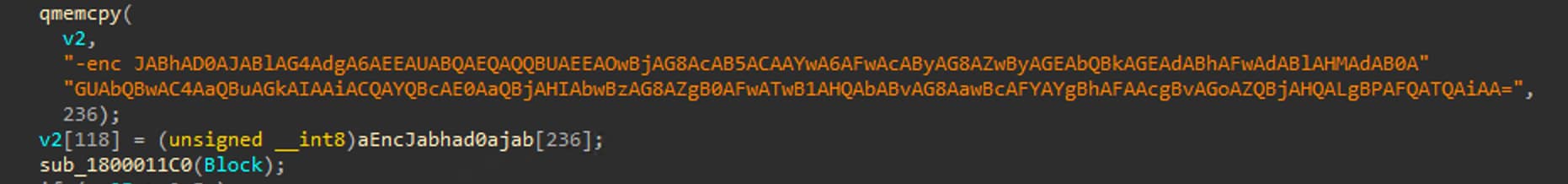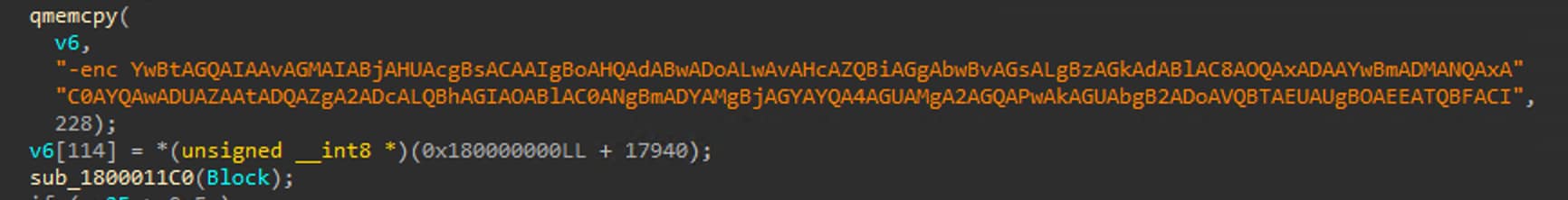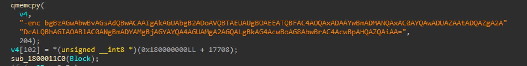 Once loaded, the DLL executes a few commands on the system. Several of them are base64 encoded Powershell commands. OneDrive.exe spawning Powershell is fairly suspicious on its own, but taking a look at the commands being executed gives a better understanding of what is going on.