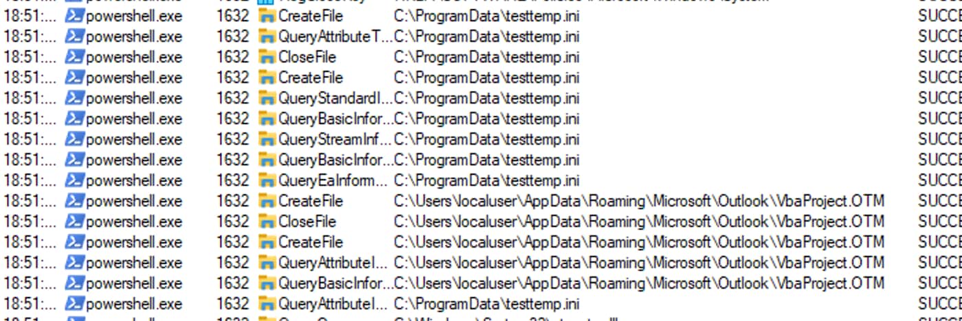 %APPDATA%\Microsoft\Outlook\VbaProject.otm is the file where Microsoft Outlook stores VBA macros that you create inside Outlook. Unlike Word or Excel, Outlook consolidates all macros into this single file. This contains your custom VBA scripts created in Outlook, such as automation tasks, custom email handling, or event-driven code. If the file exists, Outlook can load the macros at startup, which can be a security issue if the file is created by a malicious actor from outside of the program. This is exactly what the NotDoor malware was doing with the encoded Powershell command to copy the testtemp.ini file to the VBAProject.OTM file. Monitoring for file creation events of this file path from processes other than Outlook.exe is important for detecting rogue Outlook macros.
