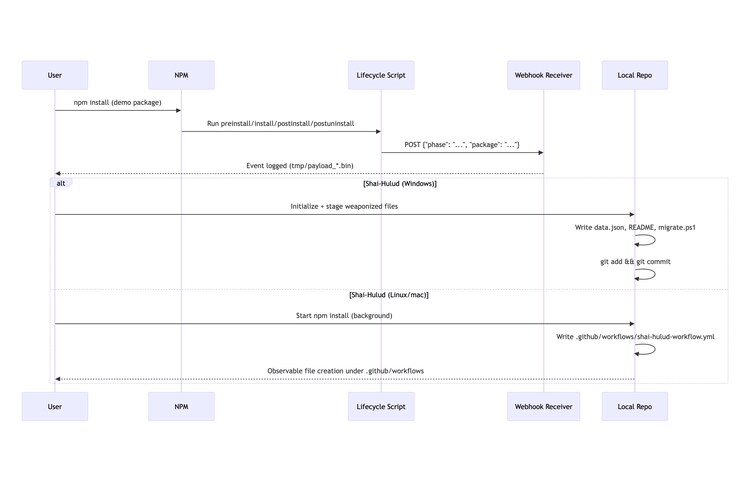 - GitHub Weaponization: Created public "Shai-Hulud Migration" repositories containing stolen secrets and injected malicious GitHub Actions workflows