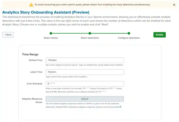Step 3. Use the suggested default values for the time range and cron schedule for detection analytics and click Enable.