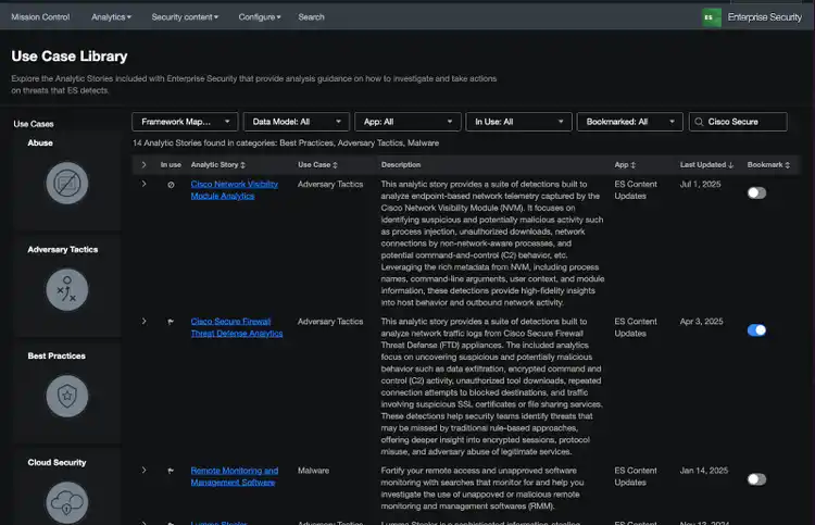 Filter by Frameworks, Data Models, Use Case Categories (e.g., Cloud Security, Abuse, Adversary Tactics) or You can also search by keywords like “Cisco,” “ransomware,” or “credential theft” to find relevant Analytic Stories.