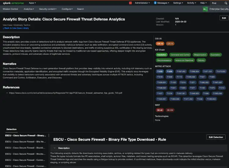 Click into a story like Cisco Secure Firewall Threat Defense Analytics and to view the detailed narrative and description of the story and the analytics included in them are detection searches, MITRE ATT&CK techniques covered, known false positives and how to implement and tune the searches.
