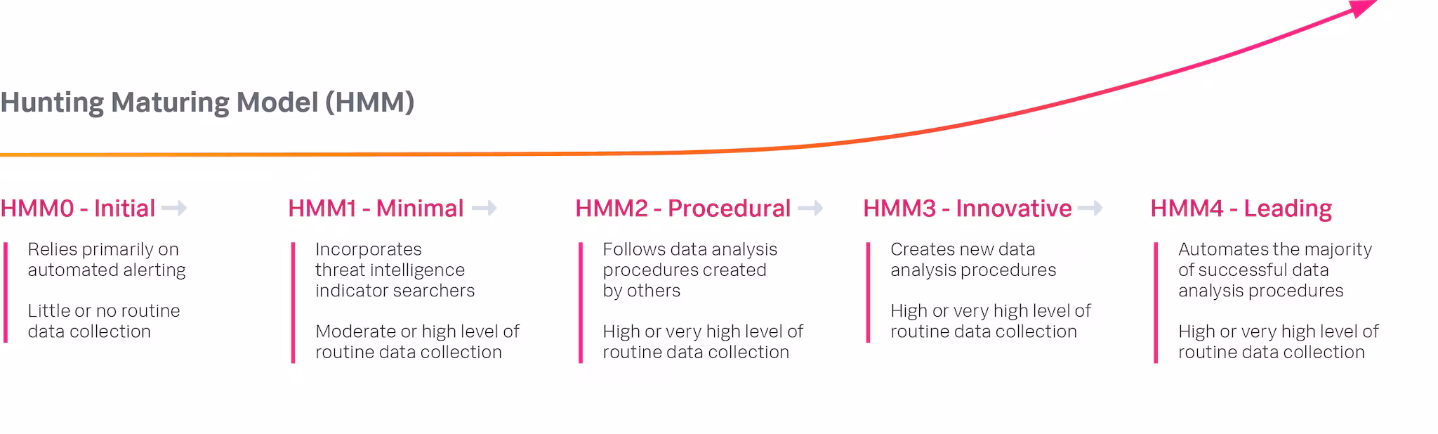 First published in 2015, the HMM gives CISOs and other hunt leaders a simple way to measure the maturity of their threat hunting program. It considers the three key measures of a threat hunting program (data collection, data access, and hunters’ analysis skills) and reduces these to a single maturity number, HMM0 - HMM4.