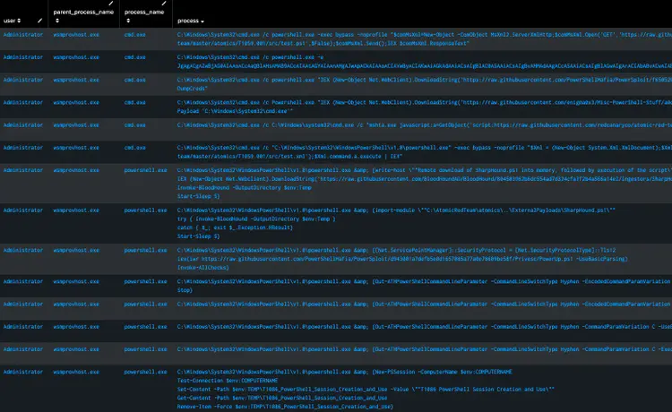 We can see in Figure 12 that we have an Administrator account that is spawning PowerShell and cmd.exe on a remote endpoint performing all kinds of functions.