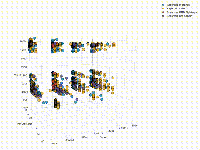ATT&CK Data in 3-D: by Technique ID, Frequency Percentage, Year
