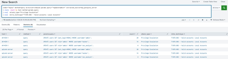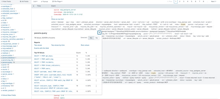 In the next example of data processed via Splunk MCP TA we can see that in the specific case of a Postgress SQL MCP server we can observe the actual queries performed via MCP. We can also observe that some of these queries may be malicious in nature, which brings another challenge with the use of MCP Servers. The dynamic nature of the instructions sent to the MCP server cannot be anticipated; this makes it even more risky when it comes to code generation or in this case a possible SQL injection.