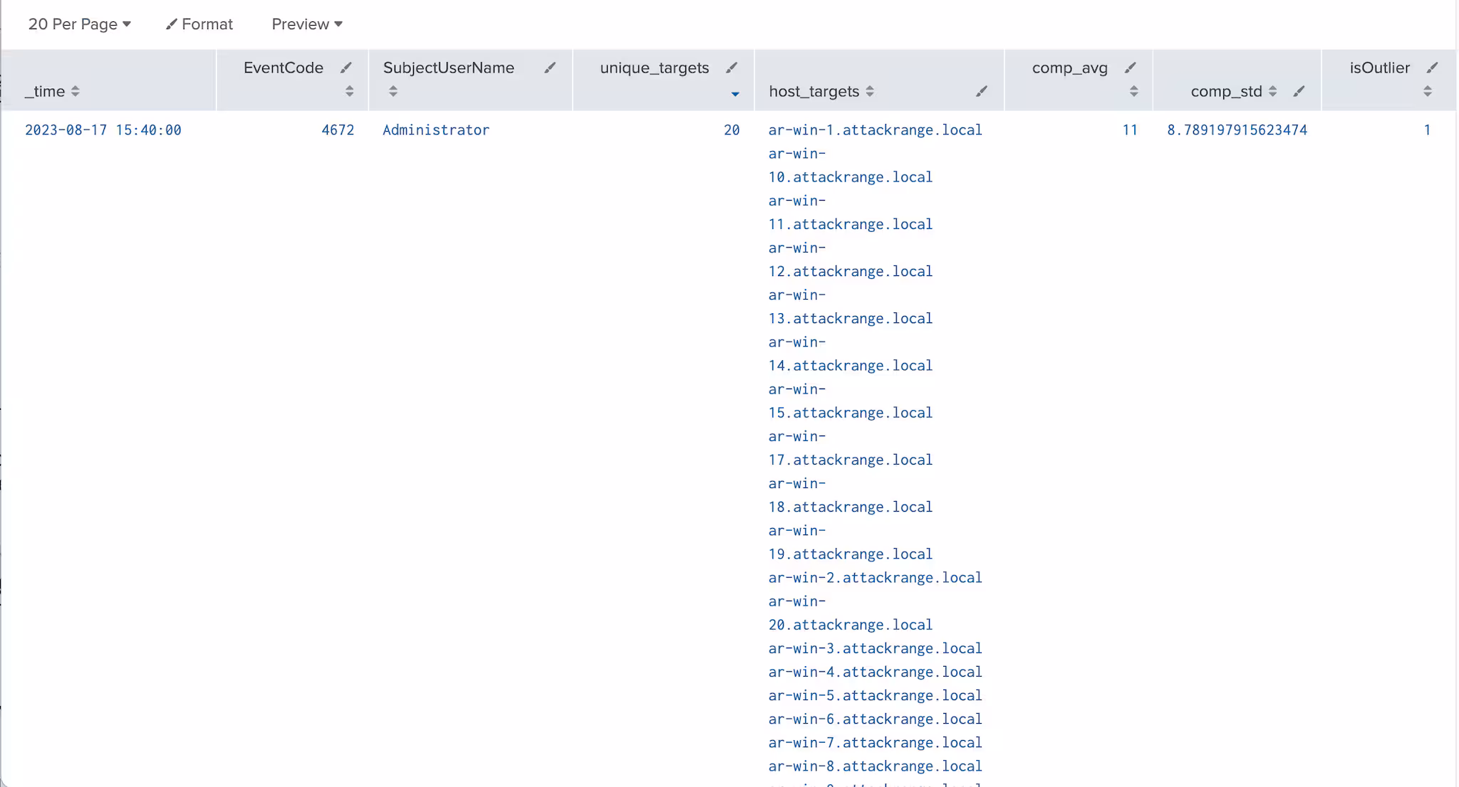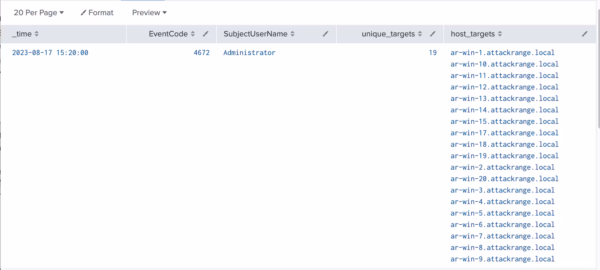 | stats dc(Computer) AS unique_targets values(Computer) as host_targets values(PrivilegeList)