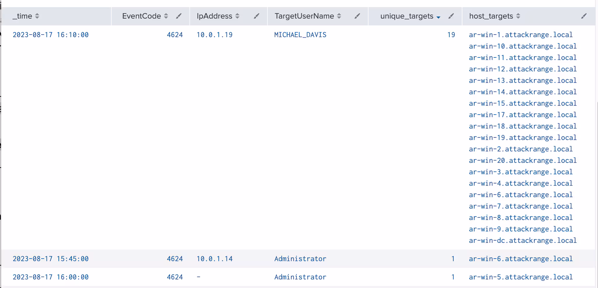 In order to enumerate all available shares on domain targets, the NetShareEnum API function authenticates to the remote endpoints using the SMB protocol. This successful authentication will generate a 4624 event on all target endpoints. Assuming security teams are ingesting authentication events across their Windows fleet, this behavior provides an interesting hunting opportunity. As 4624 events also contain the TargetUserName and IpAddress fields, we can leverage Splunk to identify one source successfully performing rapid authentication across a large number of hosts.