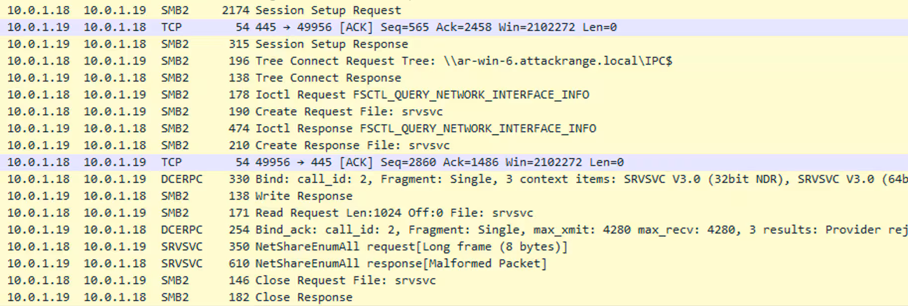Through the testing and execution of the technique, the team learned that the NetShareEnum API actually leverages Microsoft Remote Procedure Call (MSRPC) services and calls the NetShareEnumAll function to enumerate shares. This interaction happens using named pipes over the SMB protocol. Specifically, the srvsvc named pipe is used as the communication channel between the client and server as shown below.