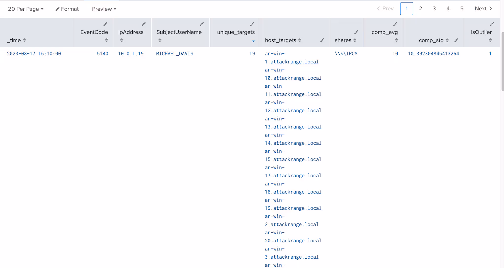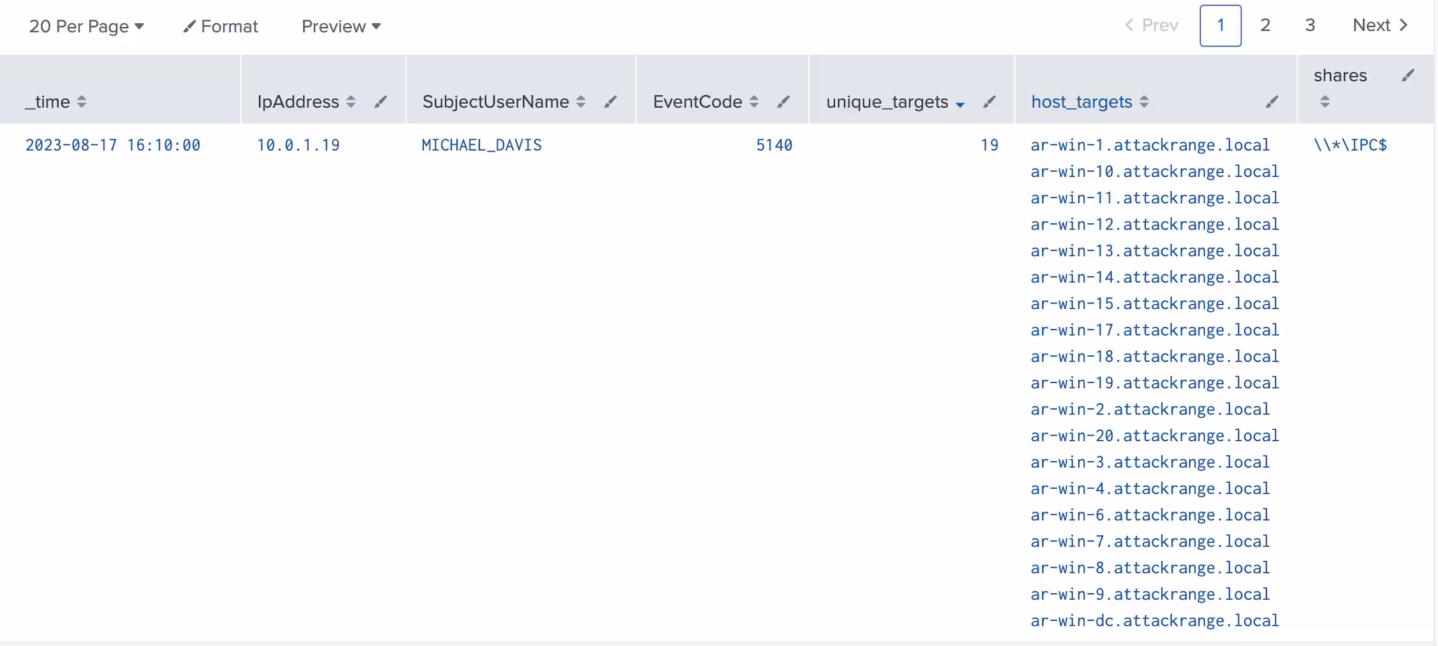| stats dc(Computer) AS unique_targets values(Computer) as host_targets values(ShareName) as shares