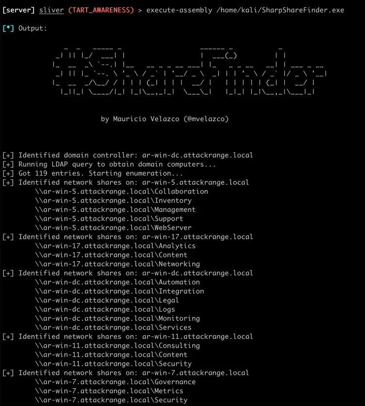 In order to effectively develop detection strategies, our first step is to simulate the technique in a lab environment. This allows us to observe its behavior and capture the resulting telemetry for analysis. In enterprise networks that span thousands of hosts, adversaries are forced to automate the discovery process. As highlighted by the The DFIR Report team, Invoke-ShareFinder is a common tool frequently employed by attackers to execute this technique. However, adversaries might choose to use alternative tools or even develop custom ones.