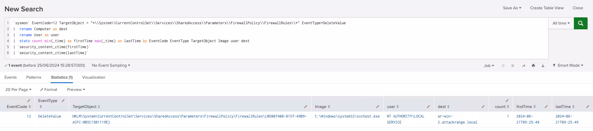 `sysmon` EventCode=12 TargetObject = "*\\System\\CurrentControlSet\\Services\\SharedAccess\\Parameters\\FirewallPolicy\\FirewallRules\\*" EventType=DeleteValue